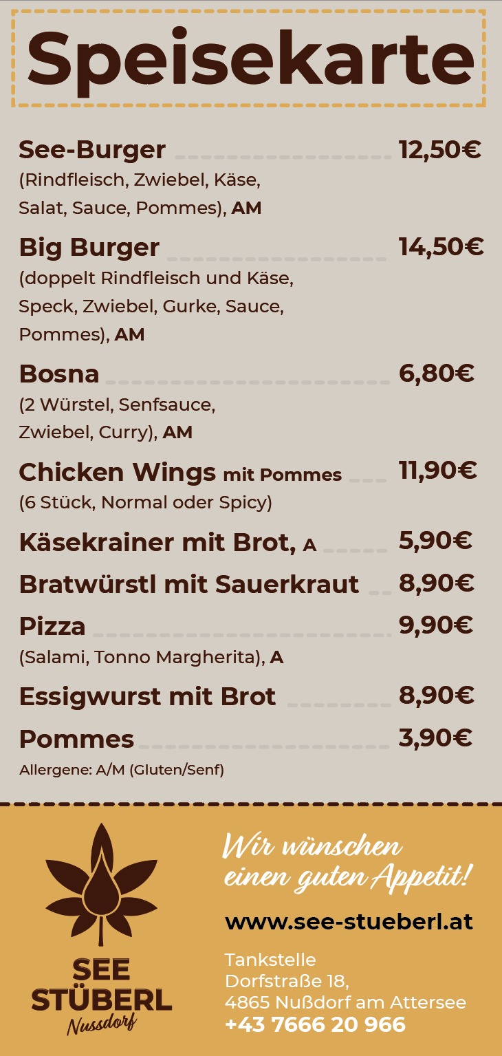 Herzlich willkommen im Seestüberl in Nussdorf am Attersee! Unsere Speisekarte vereint bodenständige Imbissklassiker mit regionalen Schmankerln – perfekt für eine gemütliche Pause am See. Ob herzhaft, knackig oder würzig – bei uns ist für jeden Geschmack etwas dabei. Lassen Sie sich kulinarisch verwöhnen und entdecken Sie, was unser Gastgarten kulinarisch zu bieten hat.